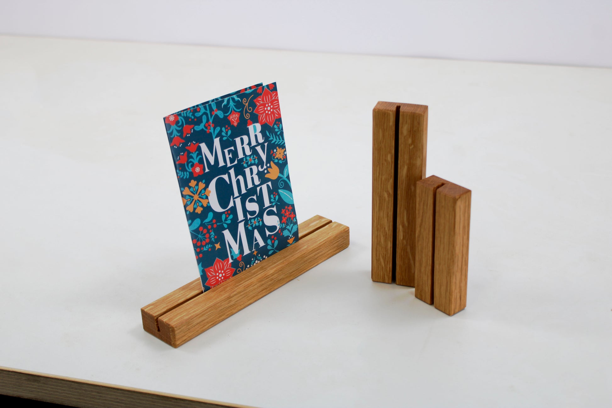 Dieser stilvolle Kartenhalter aus massiver Eiche ist das perfekte Accessoire, um Karten, Fotos oder kleine Kunstwerke elegant zu präsentieren. Jeder Halter wird in Deutschland in sorgfältiger Handarbeit gefertigt und überzeugt durch seine natürliche Holzmaserung, warme Farbe und hochwertige Verarbeitung. Ideal für Wohnräume, Büros, Cafés oder als liebevolles Geschenk zu besonderen Anlässen.