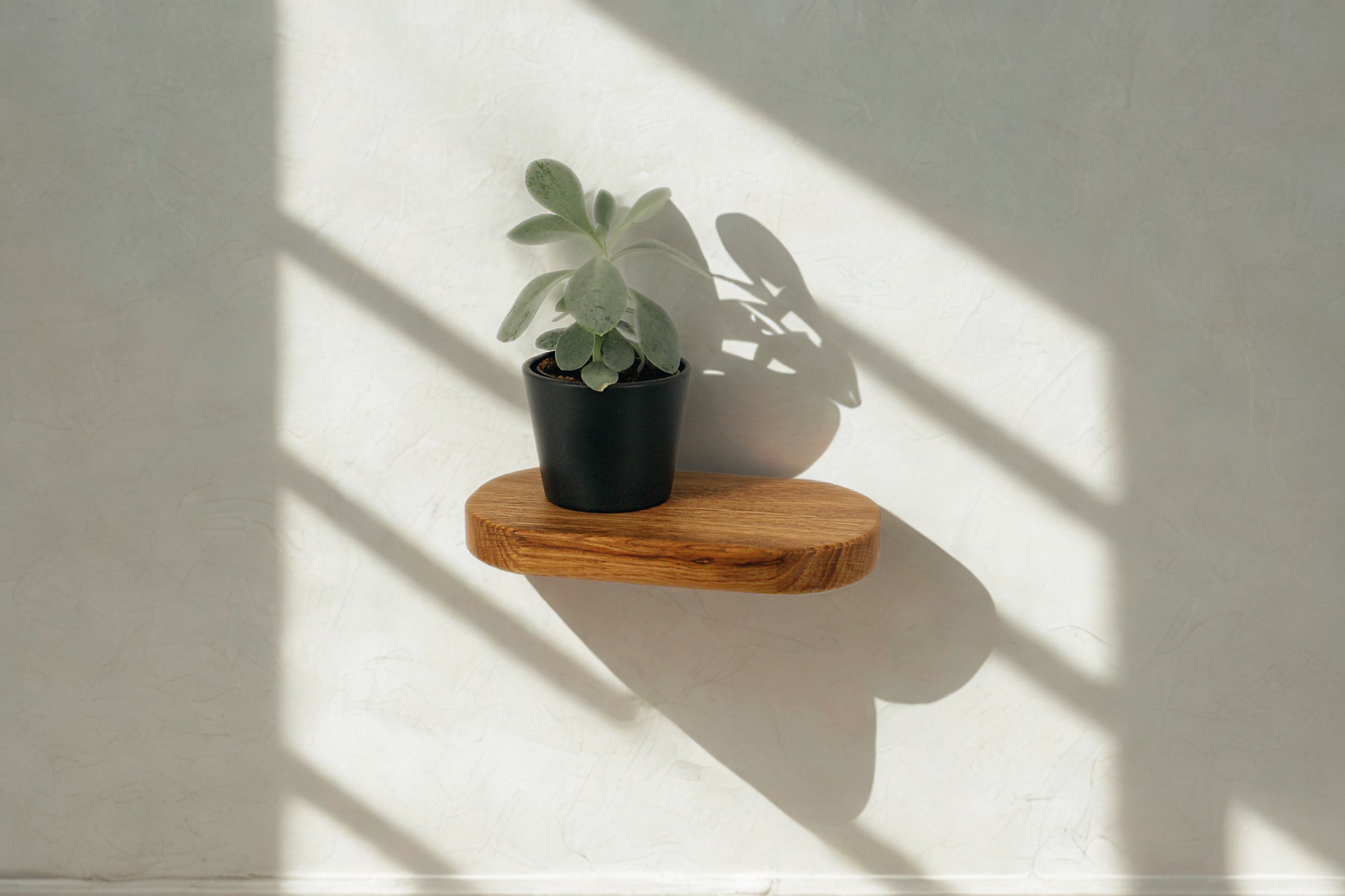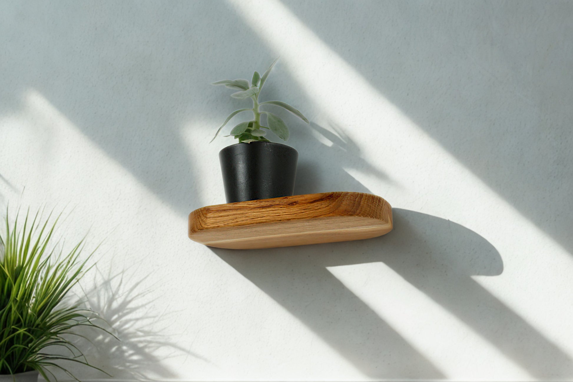 Dieses handgefertigte, ovale Regalbrett aus Eichenvollholz ermöglicht eine schnelle und einfache Wandmontage mit nur einer Schraube. Es bietet ideale Aufbewahrungsmöglichkeiten für kleinere Pflanzentöpfe und ähnliche Gegenstände.